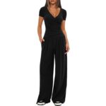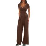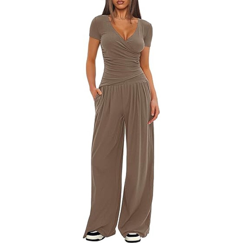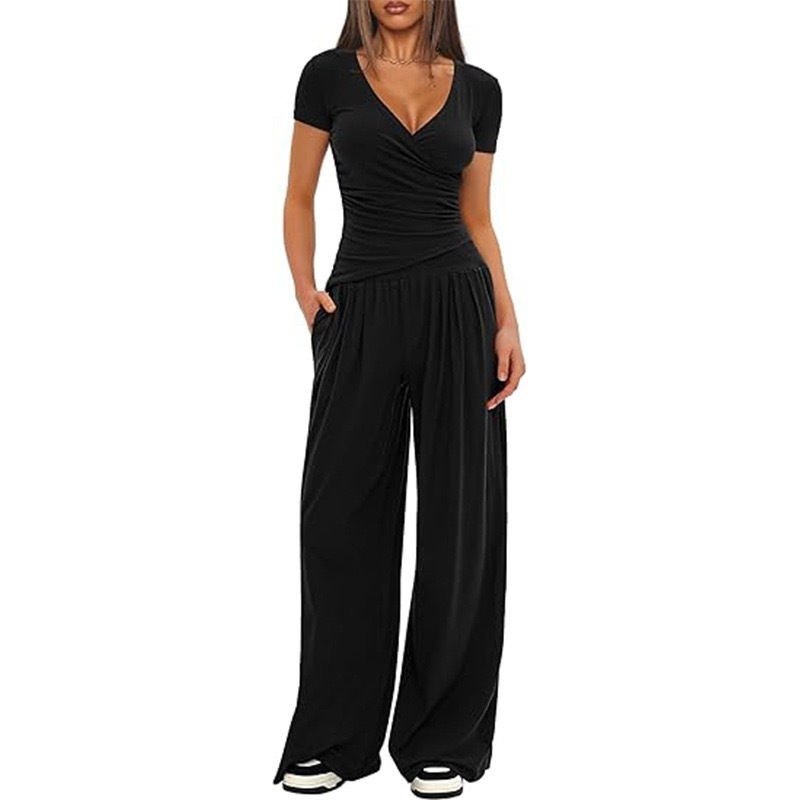 - Design: 2-piece set – V-neck fitted tee + wide-leg pants