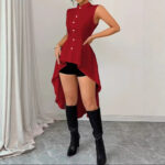 Make an unforgettable entrance in the Iconic Flow Asymmetric High-Low Shirt Top — a sleek, sculptural piece made to redefine modern elegance. Featuring a mandarin collar, a button-down front, and a dramatic high-low hem, this sleeveless top balances tailored structure with effortless movement.