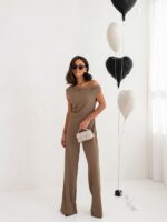 Featuring a softly draped asymmetrical neckline, this elegant evening one-piece highlights the collarbone while maintaining sophisticated coverage. The tailored bodice gently contours the waist, flowing into elongated wide-leg trousers that create graceful movement and leg-lengthening appeal.