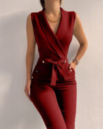 Command attention with every step in the Power Poise Sleeveless Jumpsuit. This sharp, minimalist piece features a tailored wrap-style V-neck bodice, cinched waist with a self-tie belt, and gold-tone button accents for a touch of elevated polish. The sleeveless cut adds effortless edge, while the sleek tapered legs ensure a flattering fit that works from morning meetings to midnight rendezvous.